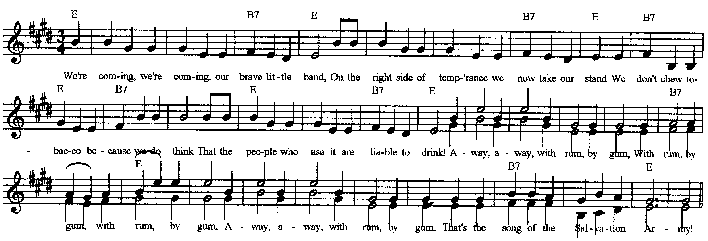 -[VERSE 8] – We never eat apples ’cause they are the food That Eve gave to Adam to make him feel nude. Now can you imagine a sorrier clod Than a man wearing fig leaves and hiding from God? Away, away with rum, by gum….. [VERSE 8] – We never eat cookies because they have yeast, And one little crumb makes a man like a beast. Now can you imagine a greater disgrace Than a man in the gutter with crumbs on his face? Away, away with rum, by gum….. [VERSE 8] – We never drink beer because it has hops, And one little glass gives a man the trots, Now can you imagine a sorrier sight Than a man drinking beer and trotting all night? Away, away with rum, by gum…..