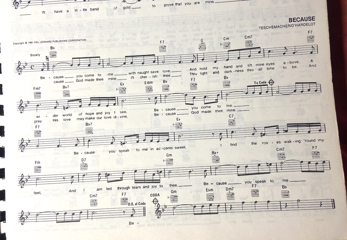 [Intro] C Em Dm G7 (1x) [Verse] C Em Because, you come to me, Dm G7 With naught save love, A/C# Dm Dm7 Dm7/G G7 And hold my hand and lift mine eyes above, C7sus C7 F A wider world of hope and joy I see, C G7 C Because you come to me! C Em Dm G7 { CHORUS } C7 F Because you speak to me in accents sweet, D7 Gm I find the roses waking 'round my feet E Am And I am led through tears and joy to thee, Adim G7 Because you speak to me! C Em Because God made thee mine, Dm G7 I’ll cherish thee, love A/C# Dm Dm7 Dm7/G G7 Through light and darkness through all time to be, C7sus C7 F And pray His love may make our love divine, C G7 C Em Dm C Because God made thee mine!X