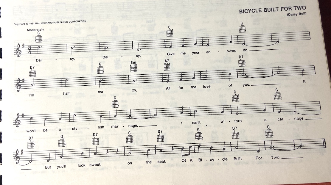 [C] Daisy!Β Daisy! [F] Give me your answer [C] true. [G] I’m half [C] crazy [F] all for the love of [G] you!Β It [F] won’t be a stylish [C] marriage.Β I [F] can’t afford a [C] carriage.Β But [C] you’ll look [F] sweet [C] upon the [F] seat of a [C] bicycle [G] built for [C] two.