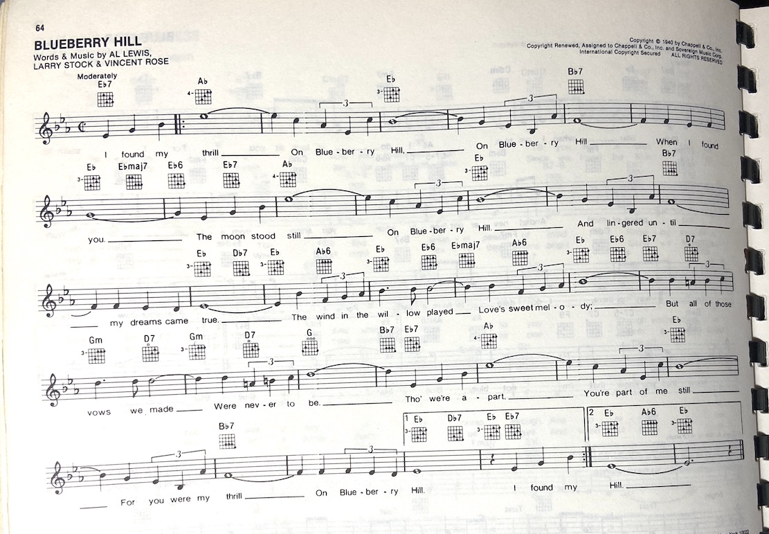 Blueberry Hill chords Fats Domino [C] I found my [F] thrill, on Blueberry [C] Hill On Blueberry [G7] Hill, when I found [C] you [ Fm C ] The [C7] moon stood [F] still, on Blueberry [C] Hill It lingered [G7] until my dreams came [C] true [ Fm C ] [C] The moon stood [F] still, on Blueberry [C] Hill. And lingered [G7] until my dreams came [C] true. [ Fm C ] The [G] wind in the [C] willow played love's [G7] sweet [C] melody But [B7] all of those [Em] vows you made [B7] Were [B7] never to [E] be [G7] [C] Though we're [F] apart, you're part of me [C] still For you were my [G7] thrill, on Blueberry [C] Hill