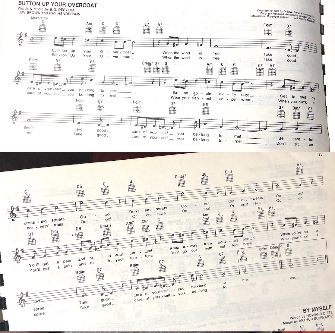 [C] Button up your overcoat, [D7] When the wind is free, [Dm7] take [G] good [Dm7] care of [G7] yourself, You [C] belong to me! [G7] [C] Eat an apple every day, [D7] Get to bed by three, [Dm7] take [G] good [Dm7] care of [G7] yourself, You [C] belong to me! [STOP] Be [C7] careful [F] crossing streets, ooh-ooh, [C] Cut out sweets, ooh-ooh, [Am] Lay off meat, [D7] ooh-[G7]ooh, [Dm7] You'll get a [G7] pain and ruin your tum-tum! [C] Wear your flannel underwear, [D7] When you climb a tree, [Dm7] take [G] good [Dm7] care of [G7] yourself, You [C] belong to me! [G7] [C] Button up your overcoat, [D7] When the wind is free, Oh [Dm7] take [G] good [Dm7] care of [G7] yourself, You [C] belong to me! [G7] [C] When you sass a traffic cop, [D7] Use diplomacy; [Dm7] take [G] good [Dm7] care of [G7] yourself, You [C] belong to me! [G7] [C] Keep away from bootleg hooch, [D7] When you're on a spree, Oh [Dm7] take [G] good [Dm7] care of [G7] yourself, You [C] belong to me! [G7] [C7] Beware of [F] frozen funds, ooh-ooh, [C] Stocks and bonds, ooh-ooh, [Am] Dockside thugs, [D7] ooh-[G7]ooh, [Dm7] You'll get a [G7] pain and ruin your bankroll ! [C] Keep the spoon out of your cup, [D7] When you're drinking tea, Oh [Dm7] take [G] good [Dm7] care of [G7] yourself, You [C] belong to me! [G7] [C7] Don't sit on [F] hornet's tails, ooh-ooh! [C] Or on nails, ooh-ooh! [Am] Or third rails, [D7] ooh-[G7]ooh, You [C] belong to me! [G7]