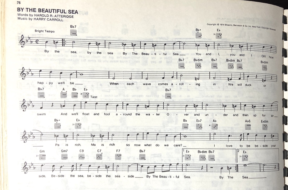 [Verse] D7 By the sea, by the sea, by the beautiful sea! G You and me, you and me, oh how happy we'll be! D7 When each wave comes a-rolling in D7 We will duck or swim, G And we'll float and fool around the water. D7 Over and under, and then up for air, G G7 Pa is rich, Ma is rich, so now what do we care? C G E7 I love to be beside your side, beside the sea, A7 D7 G Beside the seaside, by the beautiful sea!X