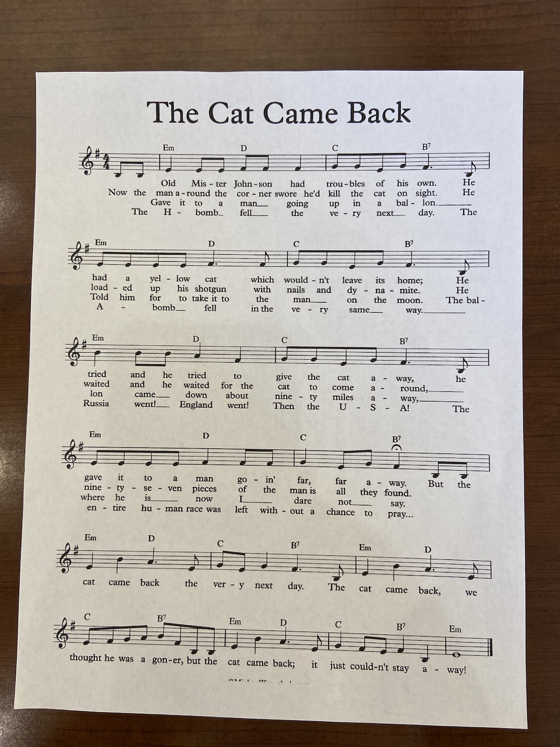 CHORUS – – – – – [Am](Em) But the cat came [G](D) back the [F](C) very next [E7](B7) day.Β The [Am](Em) cat came [G](D) back, they [F](C) thought he was a [E7](B7) goner.Β Β But the [Am](Em) cat came [G](D) back, he [F](C) just wouldn’t [E7](B7) stay away. [Am](Em)