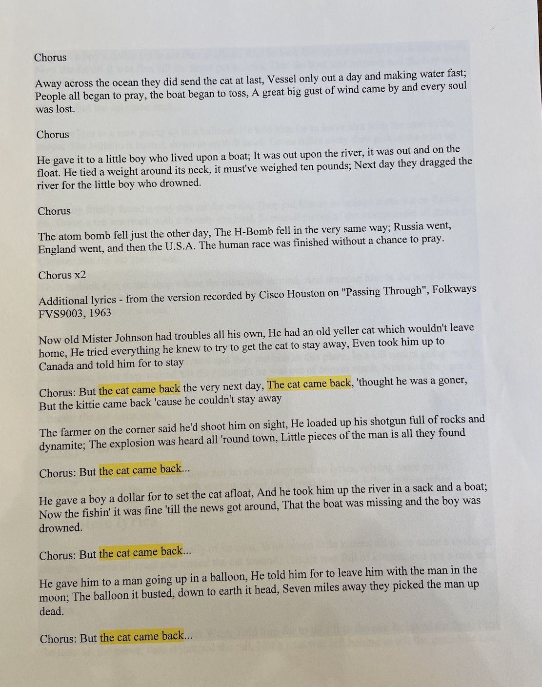 [Am](Em) Old Mr. [G](D) Johnson had [F](C) trouble all his [E7](B7) own.Β Β [Am](Em) He had a yellow [G](D) cat that [F](C) wouldn’t leave his [E7](B7) home.Β Β [Am](Em) He tried and he [G](D) tried to [F](C) give that cat [E7](B7) away.Β Β [Am](Em) He gave it to a [G](D) man going [F](C) far far [E7](B7) away