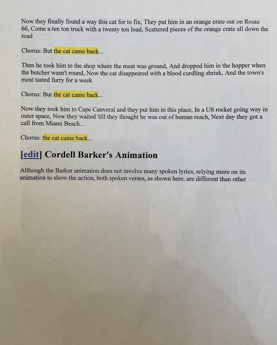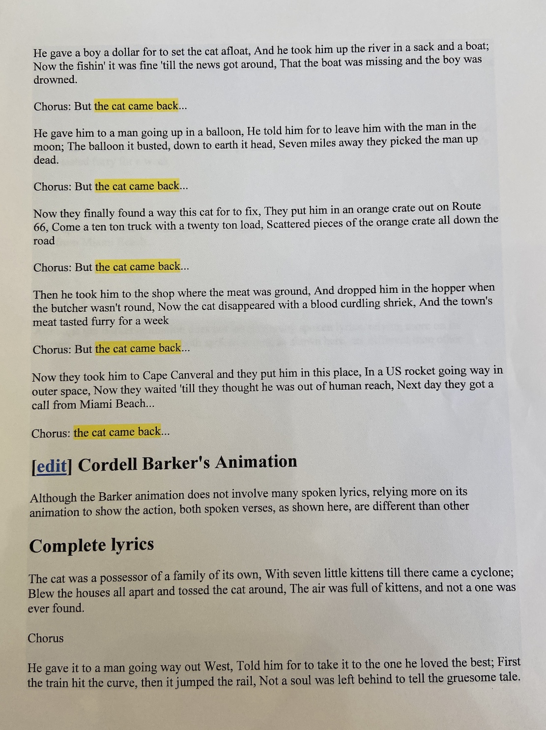 CHORUS – – – – – [Am](Em) But the cat came [G](D) back the [F](C) very next [E7](B7) day.Β The [Am](Em) cat came [G](D) back, they [F](C) thought he was a [E7](B7) goner.Β Β But the [Am](Em) cat came [G](D) back, he [F](C) just wouldn’t stay [E7](B7) away. [Am](Em)