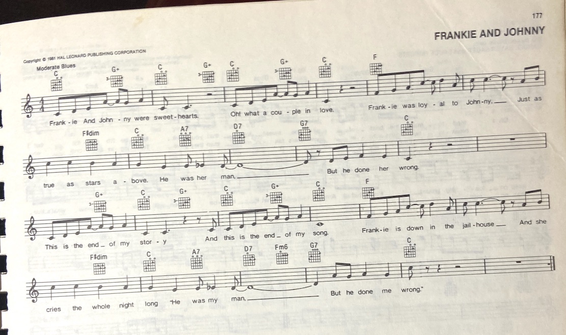 [C] Frankie drew back her kimona. She took out a little forty-[C7] four. [F] Rooty-toot-toot, three times she shot right through that hardwood [C] door. She shot her [G7] man. He was doing her [C] wrong.