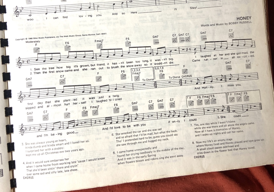 [Intro] Dm7 G7 C Cmaj7 C6 [Verse 1] C See the tree, how big it's grown, Cmaj7 C7 but friend it hasn't been too long, Dm7 G7 Dm7 G7 it wasn't big. Dm7 G7 I laughed at her and she got mad, Dm7 G7 the first day that she planted it, C Cmaj7 C6 was just a twig. [Verse 2] C Then the first snow came, Cmaj7 C7 and she ran out to brush the snow away, Dm7 G7 Dm7 G7 so it wouldn't die. Dm7 G7 Came runnin' in all excited, Dm7 G7 slipped and almost hurt herself, C Cmaj7 C6 and I laughed till I cried. [Verse 3] C She was always young at heart, Cmaj7 C7 kinda dumb and kinda smart, Dm7 G7 Dm7 G7 and I loved her so. Dm7 G7 And I surprised her with a puppy, Dm7 G7 kept me up all Christmas Eve, C Cmaj7 C6 two years ago. [Verse 4] C And it would sure embarrass her, Cmaj7 C7 when I came in from workin' late, Dm7 G7 Dm7 G7 'cause I would know. Dm7 G7 That she'd been sittin' there and cryin', Dm7 G7 Over some sad and silly, C Cmaj7 late, late show. { CHORUS } C6 Dm7 G7 Dm7 And honey, I miss you, G7 C Cmaj7 and I'm bein' good. C6 Dm7 G7 Dm7 And I'd love to be with you, G7 C Cmaj7 C6 if only I could. [Verse 5] C She wrecked the car and she was sad, Cmaj7 C7 and so afraid that I'd be mad, Dm7 G7 Dm7 G7 but what the heck. Dm7 G7 Though I pretended hard to be, Dm7 G7 guess you could say she saw through me, C Cmaj7 C6 and hugged my neck. [Verse 6] C I came home unexpectedly, Cmaj7 C7 and caught her cryin' needlessly, Dm7 G7 Dm7 G7 in the middle of the day. Dm7 G7 And it was in the early spring, Dm7 G7 when flowers bloom and robins sing, C Cmaj7 she went away. { CHORUS } C6 Dm7 G7 Dm7 And honey, I miss you, G7 C Cmaj7 and I'm bein' good. C6 Dm7 G7 Dm7 And I'd love to be with you, G7 C Cmaj7 Em7 A7 if only I could. [Verse 7] D One day while I was not at home, Dmaj7 D7 while she was there and all alone, Em7 A7 Em7 A7 the angels came. Em7 A7 Now all I have is memories, Em7 A7 of Honey and I wake up nights, D Dmaj7 D6 and call her name. [Verse 8] D Now my life's an empty stage, Dmaj7 D7 where Honey lived and Honey played, Em7 A7 Em7 A7 and love grew up. Em7 A7 And a small cloud passes overhead, Em7 A7 and cries down on the flower bed, D Dmaj7 D6 that Honey loved. [Verse 9] D And see the tree how big it's grown, Dmaj7 D7 but friend it hasn't been too long, Em7 A7 Em7 A7 it wasn't big. (in fade out) Em7 A7 And I laughed at her and she got mad, Em7 A7 the first day that she planted it, D Dmaj7 D6 was just a twig.