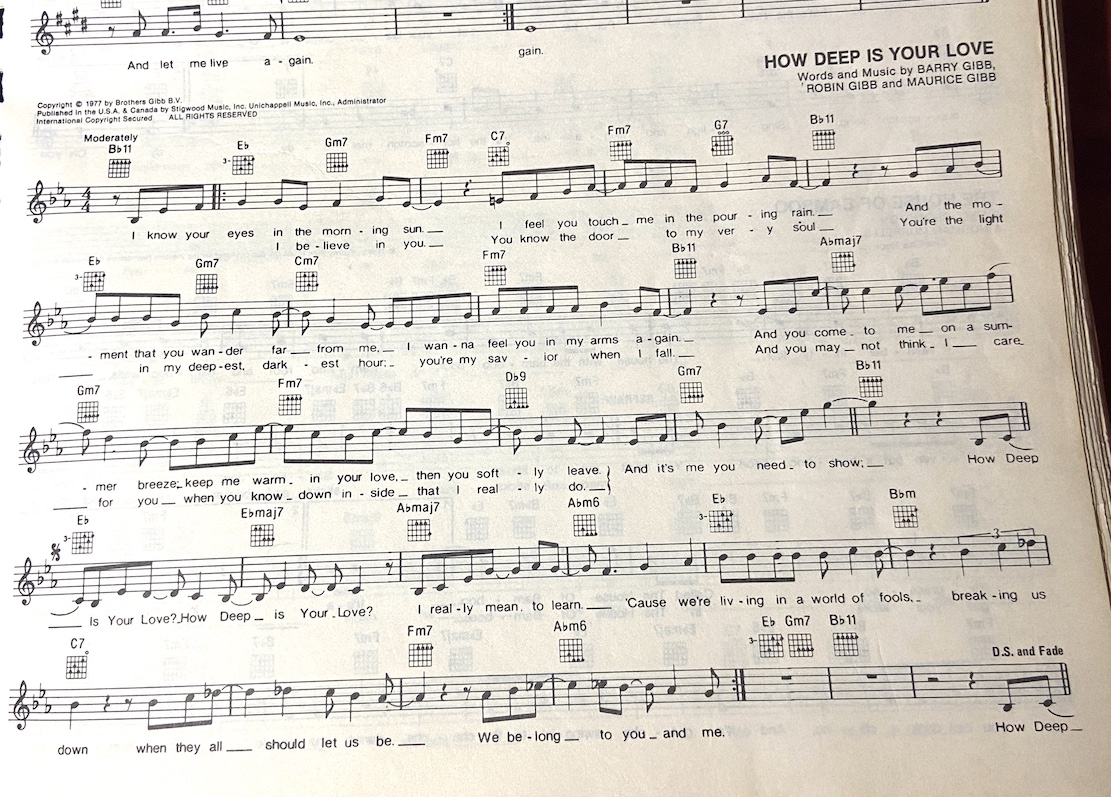 HOW DEEP IS YOUR LOVE Capo 1 [Intro] D G D G [Verse 1] D F#m Em I know your eyes in the morning sun B Em F# G I feel you touch me in the pouring rain D F#m Bm And the moment that you wander far from me Em G I wanna feel you in my arms again [Pre-Chorus] G F#m Then you come to me on a summer breeze Em C Keep me warm in your love, then you softly leave F#m G And it's me you need to show { CHORUS } D How deep is your love D How deep is your love, how deep is your love G Gm I really mean to learn D Am B 'Cause we're living in a world of fools, breaking us down Em Gm D When they all should let us be, we belong to you and me [Verse 2] F#m Em I believe in you B Em F# G You know the door to my very soul D F#m Bm You're the light in my deepest darkest hour Em G You're my saviour when I fall G F#m And you may not think I care for you Em C When you know down inside that I really do F#m G And it's me you need to show, { CHORUS } D How deep is your love D How deep is your love, how deep is your love G Gm I really mean to learn D Am B 'Cause we're living in a world of fools, breaking us down Em Gm D When they all should let us be, we belong to you and me [Instrumental] D F#m Em B Em F# G D F#m Bm Em G [Pre-Chorus] G F#m Then you come to me on a summer breeze Em C Keep me warm in your love, then you softly leave F#m G And it's me you need to show { CHORUS } D How deep is your love D How deep is your love, how deep is your love G Gm I really mean to learn D Am B 'Cause we're living in a world of fools, breaking us down Em Gm D When they all should let us be, we belong to you and me [Interlude] D F#m G { CHORUS } D How deep is your love, how deep is your love G Gm I really mean to learn D Am B 'Cause we're living in a world of fools, breaking us down Em Gm D G When they all should let us be, we belong to you and me D How deep is your love, how deep is your love G Gm I really mean to learn D Am B 'Cause we're living in a world of fools, breaking us down Em Gm D When they all should let us be, we belong to you and meX