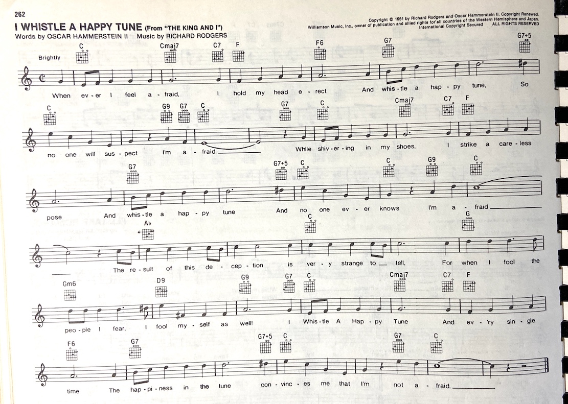 [Verse 1] G C Whenever I feel afraid I hold my head erect D G D G And whistle a happy tune so no one will suspect I'm afraid G C While shivering in my shoes I strike a careless pose D G D G And whistle a happy tune and no one ever knows I'm afraid [Bridge] Eb G The result of this deception is very strange to tell D A A7 D7 For when I fool the people I fear I fool myself as well [Verse 2] G C I whistle a happy tune and every single time D G D G The happiness in the tune convinces me that I'm not afraid C G Make believe you're brave and the trick will take you far C G You may be as brave as you make believe you are [Instrumental] C G [Outro] A D G You may be as brave as you make believe you are