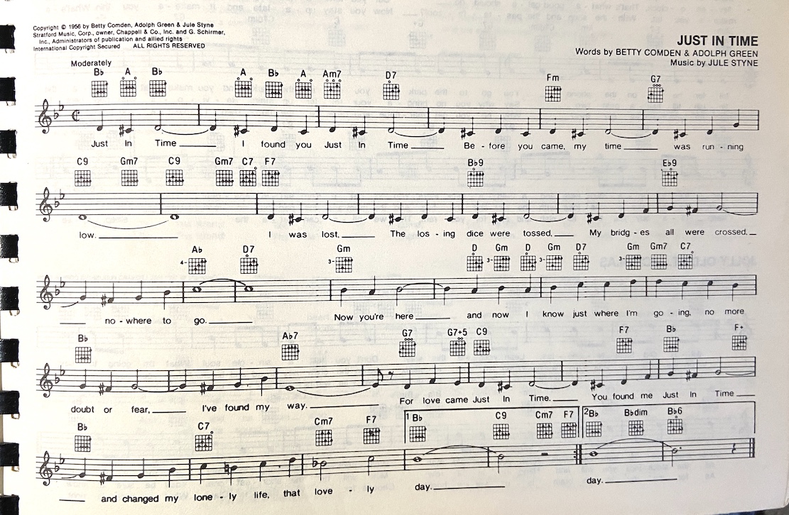 Just In Time ā Frank Sinatra (1957) Original in āDā Intro: C Verse C D Bm E Just in time, I found you just in time, Gm A D Before you came my time, was running low. G A#m G A#m G A#m C I was lost; the losing dice were tossed, A# E My bridges all were crossed, nowhere to go. Bridge Am D# Am E Am D Now you're here, and now I know just where I'm going, C D A No more doubt or fear, I've found my way. A Am G Dm C G C For love came just in time, you found me just in time, D Dm G C Am Dm G And changed my lonely life, that lovely day. Intrumental - chords of verse Bridge E Am D# Am E Am D Now you're here, and now I know just where I'm going, C D A No more doubt or fear, 'Cause I've found my way. A Am G Dm C G C For love came just in time, you found me just in time, D Dm G C Am Dm C And changed my, lonely life, that lovely day.X