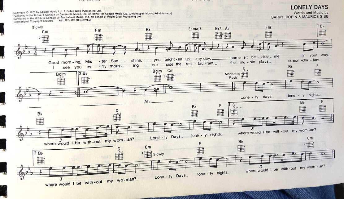 Recording is a bit flat. Tempo: 74 / 94: Chorus [Intro] Am [Verse 1] Am Dm G Cmaj7 C7 Good morning mister sunshine, you brighten up my day, (Down Strokes) F Dm G G G G#m Come sit beside me in your way. [Verse 2] Am Dm G Cmaj7 C7 I see you every morning, outside the restaurant, F Dm G G G G#m The music plays so nonchalant. [Bridge] 74 > 94: Am { CHORUS } A G D G A Lonely days, lonely nights, where would I be without my woman? A G D G A Lonely days, lonely nights, where would I be without my woman? A G D G A Lonely days, lonely nights, where would I be without my woman? 94 > 74 A G D G A Am Lonely days, lonely nights, where would I be without my woman? Am G D G Am Lonely days, lonely nights, where would I be without my woman? [Bridge] Am [Verse 3] Am Dm G Cmaj7 C7 Good morning, mister sunshine, you brighten up my day, F Dm G G G G#m Come sit beside me in your way. [Bridge] 74 > 94: Am { CHORUS } A G D G A Lonely days, lonely nights, where would I be without my woman? A G D G A Lonely days, lonely nights, where would I be without my woman? A G D G A Lonely days, lonely nights, where would I be without my woman? 94 > 74 A G D G A Am Lonely days, lonely nights, where would I be without my woman? Am G D G Am Lonely days, lonely nights, where would I be without my woman?X