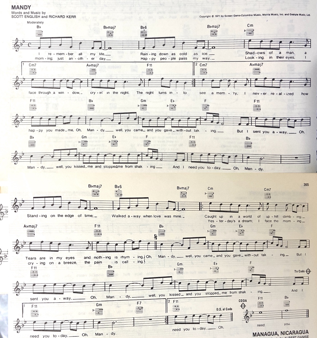 D - Barry Manilow [D] I remember all my life, [F#m] Raining down as cold as ice, [Em] Shadows of a man, A face through a window, [C] Crying in the night, The [A] night goes into, [D] Morning, just another day, [F#m] Happy people pass my way, [Em] Looking in their eyes, I see a memory, [C] I never realized, How [A] happy you made me, { CHORUS } . . . Oh, [D] Mandy, Well, you [Bm] came, and you [G] gave without [A] taking, but I [G] sent you [A] away. Oh, [D] Mandy, Well, you [Bm] kissed me, and [G] stopped me from [A] shaking, and I need you today, Oh, [D] Mandy, [Bm] [G] [A] [D] I'm standing on the edge of time. I [F#m] walked away when love was mine. [Em] Caught up in a world, of uphill climbing, [C] The tears are in my eyes, and [A] nothing is rhyming, { CHORUS } [Em] Yesterday's a dream, I face the morning [C] Crying on a breeze, The [A] pain is calling { CHORUS }