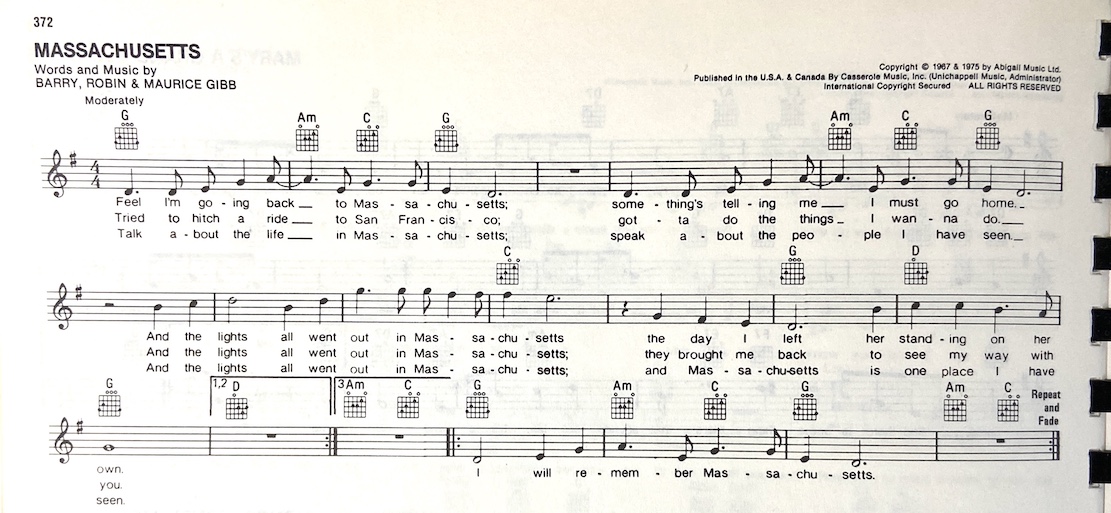 [G] Feel I'm goin' [Am] back to [C] Massa- [G] -chusetts [G] Something's telling [Am] me I [C] must go [G] home And the [G] lights all went out in Massa- [C] -chusetts The day I [G] left her [D] standing on her [G] own [G] Tried to hitch a [Am] ride to [C] San [G] Francisco [G] Gotta do the [Am] things I [C] wanna [G] do And the [G] lights all went out in Massa- [C] -chusetts They brought me [G] back to [D] see my way with [G] you [G] Talk about the [Am] life in [C] Massa- [G] -chusetts [G] Speak about the [Am] people [C] I have [G] seen And the [G] lights all went out in Massa- [C] -chusetts And [G] Massachusetts is one place I have seen [G] I will be [Am] back to [C] Massa- [G] -chusetts [G] I will be [Am] back to [C] Massa- [G] -chusetts