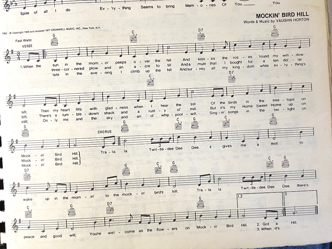 When it’s late in the evenin’ I climb up the hill, and survey all my kingdom while everything’s still, only me and the sky and an old whippoorwill, singing songs in the twilight on mockin’bird hill,