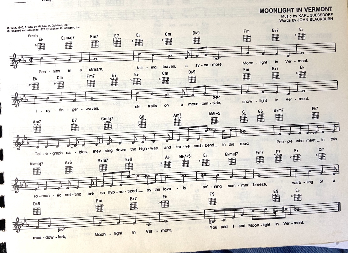 Moonlight in Vermont, performed by Willie Nelson Cmaj7 Dm7 Fdim Cmaj7 Pennies in a stream Am Bb7 Bm7 Falling leaves of sycamore Fm7 C Dm7 G Moonlight in Vermont Cmaj7 Dm7 Fdim Cmaj7 Icy finger waves Am Bb7 Bm7 Ski trails on a mountainside Fm7 C Snowlight in Vermont F#m7 B7 Emaj7 C#m Telegraph cables, they sing down the highway F#m7 Emaj7 C#m As they travel each bend in the road Gm7 C7 Fmaj7 Cdim People who meet in this romantic setting Gm7 C7 F Fdim Are so hypnotized by the lovely---- Cmaj7 Dm7 Fdim Cmaj7 Evening summer breeze Am Bb7 Bm7 Warbling of the meadowlark Fm7 C Moonlight in Vermont F Fm Fdim C You and I and moonlight in Vermont Cmaj7 - X,3,2,0,0,0 Dm7 - X,5,7,5,6,5 Fdim - X,X,3,4,3,4 Am - X,0,2,2,1,0 Bb7 - X,1,3,1,3,1 Bm7 - X,2,4,2,3,2 Fm7 - 1,X,1,1,1,X C - X,3,2,0,1,0 G - 3,2,0,0,3,3 F#m7 - 2,X,2,2,2,X B7 - X,2,1,2,0,2 Emaj7 - 0,2,1,1,0,0 C#m - X,4,6,6,5,4 Gm7 - 3,X,3,3,3,X C7 - X,3,2,3,1,X Fmaj7 - 1,3,2,2,1,1 Cdim - X,3,4,2,4,2 F - 1,3,3,2,1,1 Fm - 1,3,3,1,1,1X