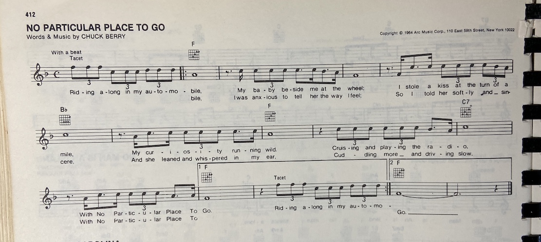 NO PARTICULAR PLACE TO GO As recorded by George Thorogood & The Destroyers (From the 1982 Album BAD TO THE BONE) [Intro] D N.C. [Verse 1] G Riding along in my automobile G My baby beside me at the wheel C I stole a kiss at the turn of a mile G My curiosity running wild D Crusin' and playin' the radio G With no particular place to go [Verse 2] G Riding along in my automobile G I's anxious to tell her the way I feel C So I told her softly and sincere G And she leaned and whispered in my ear D Cuddlin' more and drivin' slow G With no particular place to go [Guitar Solo] G C G D C G C G D C G [Verse 3] G No particular place to go G So we parked way out on ko-ko-mo C The night was young and the moon was gold G So we both decided to take a stroll D Can you image the way I felt G I couldn't unfasten her safety belt [Verse 4] G Riding along in my calaboose G Still trying to get her belt a-loose C All the way home I held a grudge G For the safety belt that wouldn't budge D Cuddlin' more and ridin' slow G With no particular place to go [Guitar Solo] G C G D C G C G D C G [Verse 5] G No particular place to go G So we parked way out on ko-ko-mo C The night was young and the moon was gold G So we both decided to take a stroll D Can you image the way I felt G I couldn't unfasten her safety belt [Verse 6] G Riding along in my calaboose G Still trying to get her belt a-loose C All the way home I held a grudge G For the safety belt that wouldn't budge D Crusin' and playin' the radio G With no particular place to go [Outro-Guitar Solo] G C G D C G C G D C G C G D C G GX