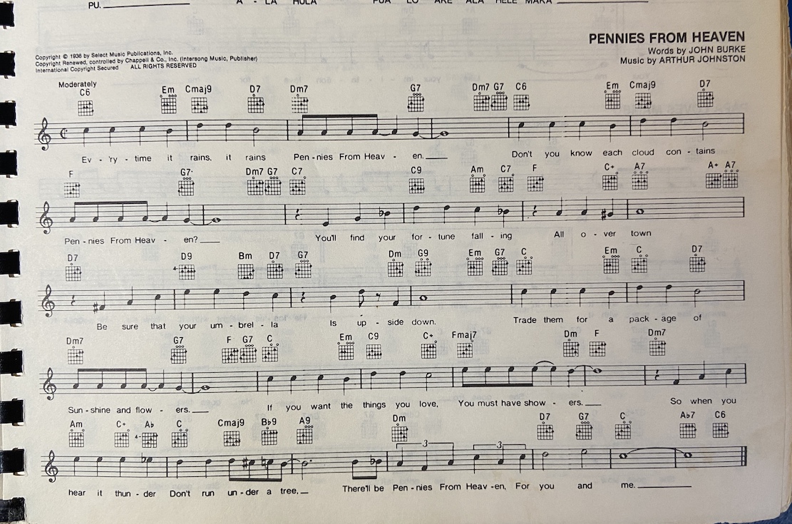 [Verse 1] G Bm A7sus4 A7 Ev'ry time it rains, it rains C D7 Pennies from heaven. G Bm A7sus4 A7 Don't you know each cloud contains C D7 Pennies from heaven? [Verse 2] G7 C G C E7 You'll find your fortune falling all over town A7 D9 D7 D9 D7 Be sure that your umbrella is upside down. G Bm A7sus4 A7 Trade them for a package of C D7 Sunshine and flowers [Verse 3] G Bm G9 G9 C If you want the things you love, C/B Am You must have showers. C C/B Am Em B C C9 Bm7b5 E7 So when you hear it thunder, don't run under a tree Bm7b5 A7 D7 G Gdim D7 There'll be pennies from heaven for you and me.X