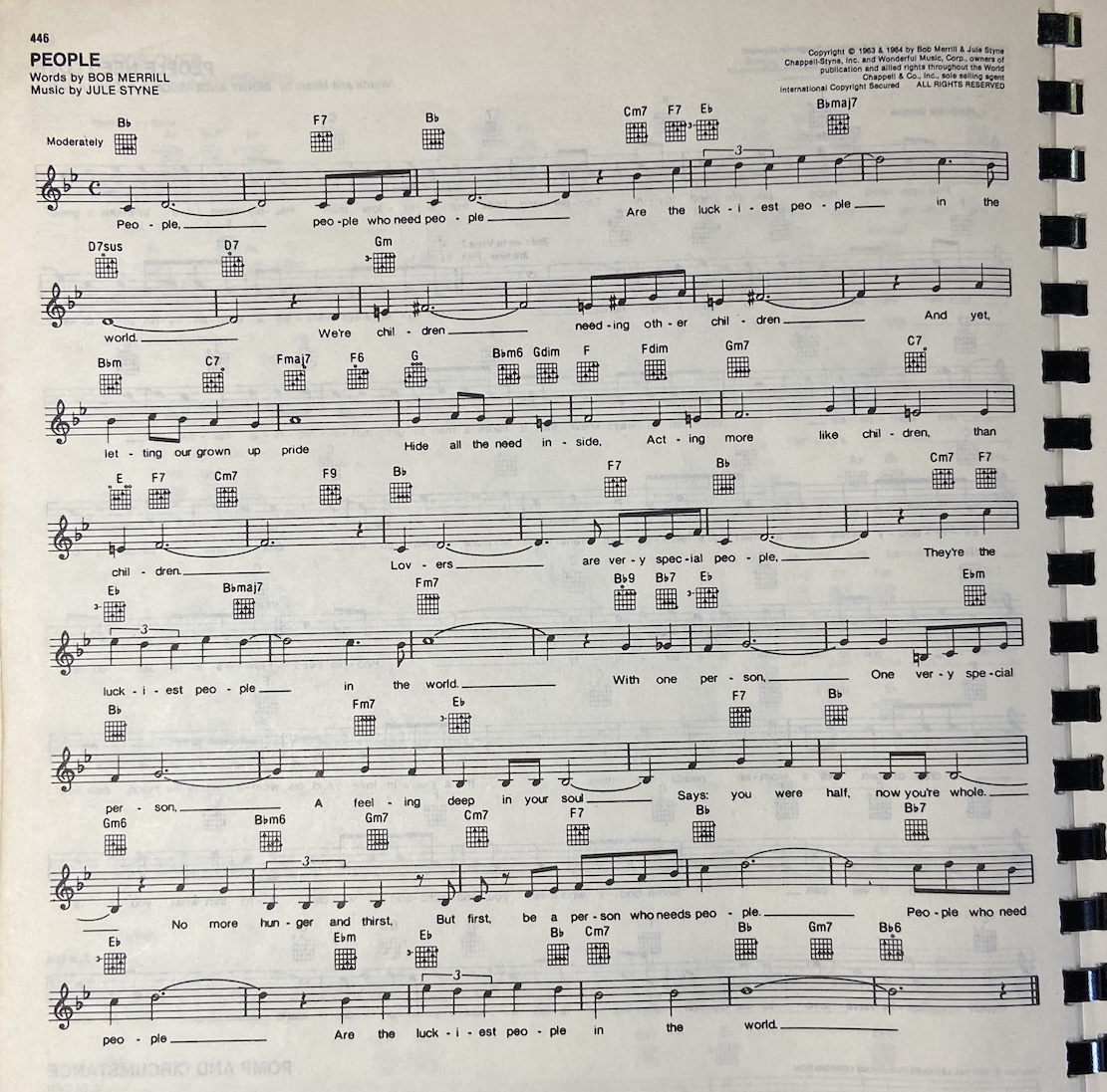 PEOPLE transcription and chart Peter Kruger casparus60@yahoo.com |C | | |Dm | * * * * * * * * * * * * * * * * |Dm |C |Dm * * * * * * * People C Dm G People who need people C E Are the luckiest people in the world Am We're children, needing other children Am D G And yet letting a grown-up pride A Am G Dbm Hide all the need inside Am D Acting more like children Am Dm G than children C Dm Lovers, C Dm G Are very special people C Gm C They're the luckiest people in the world F With one person Em C One very special person C F G A feeling deep in your soul C D Says you were half now you're whole C Am No more hunger and thirst Dm C But first be a person who needs people F Dm People who need people C Dm C Are the luckiest people in the world F Em C With one person, one very special person F G A feeling deep in your soul C D Says you were half now you're whole C No more hunger and thirst Dm C But first be a person who needs people F A# People who need people C Dm G# C Are the luckiest people in the world ....X