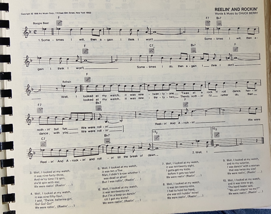 Reelin' And Rockin: Chuck Berry Top of the charts in 1959 #1. G Sometimes I will, then again I think I won't. C G Sometimes I will, then again I think I won't. D G D Sometimes I do, then again I think I don't. #2. G Well, I looked at my watch, it was 9:21, we was at a rock 'n' roll dance having nothing but fun. C G And we rolled, reelin' and a rockin'. D We was reelin' and a rockin', C G D Rollin' till the break of dawn. #2. G Well, I looked at my watch, it was 9:32, there's nothing I would rather do than dance with you. C G And we rolled, reelin' and a rockin'. D We was reelin' and a rockin', C G D Rollin' till the break of dawn. #3. G Well, I looked at my watch, it was 9:43. And every time I spinned she would spin with me. C G And we rolled, reelin' and a rockin'. D We was reelin' and a rockin', C G D Rollin' till the break of dawn. #4. G Well, I looked at my watch, it was 9:54. I said, dance ballerina girl, go go go! C G And we rolled, reelin' and a rockin'. D We was reelin' and a rockin', C G D Rollin' till the break of dawn. #5. G Well, I looked at my watch, it was 10:05. Man, I didn't know if I was dead or alive. C G And I was rollin', reelin' and a rockin'. D We was reelin' and a rockin', C G D Rollin' till the break of dawn. #6. G Well, I looked at my watch, it was 10:26. But I'm gonna keep on dancing till I get my kicks. C G And we reeled, reelin' and a rockin'. D We was reelin' and a rockin', C G D Rollin' till the break of dawn. #7. G Well, I looked at my watch, it was 10:28. I gotta get my kicks before it gets too late. C G And we was reelin', reelin' and a rockin'. D We was reelin' and a rockin', C G D Rollin' till the break of dawn. #8. G Well, I looked at my watch, it was 10:29. I had to hold her hand, she was still holding mine. C G And we reeled, reelin' and a rockin'. D We was reelin' and a rockin', C G D Rollin' till the break of dawn. #9. G Well, I looked at my watch and to my surprise, I was dancing with a woman that was twice my size. C G I was reelin', reelin' and a rockin'. D We was reelin' and a rockin', C G D Rollin' till the break of dawn. #10. G Well, I looked at my watch and it was time to go. The bandleader said "We ain't playing no more." C G And we was reelin', reelin' and a rockin'. D We was reelin' and a rockin', C G well, till the break of dawn. A fifties smash from Kraziekhat.X