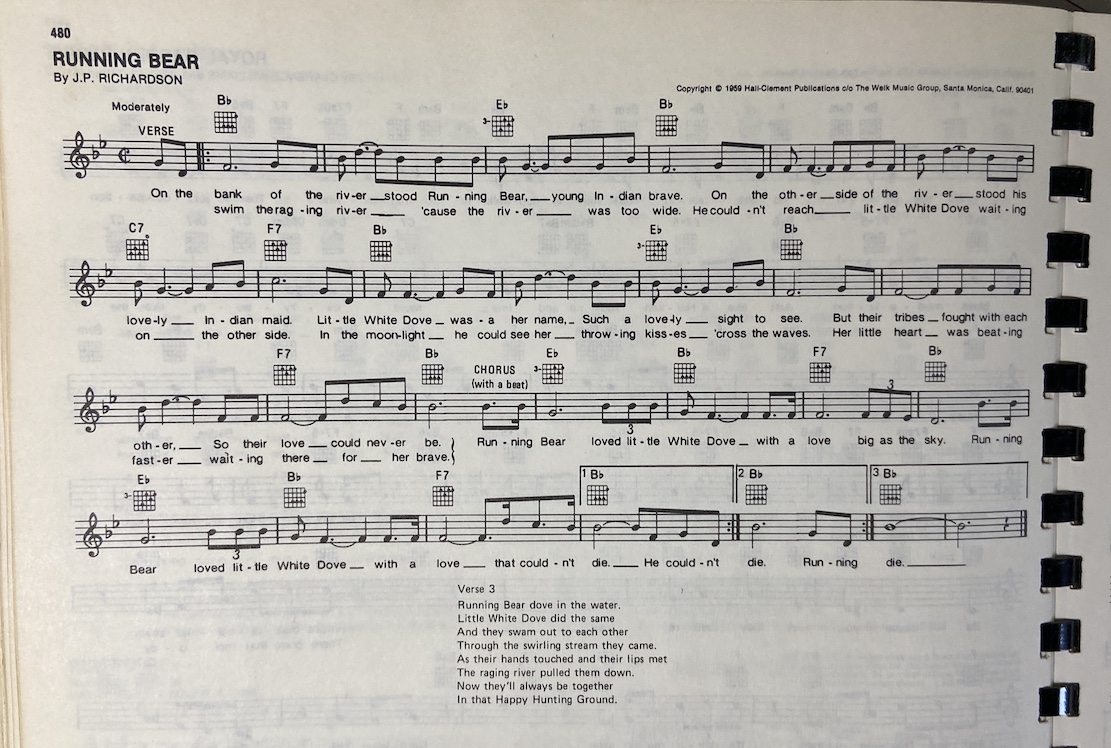 G C G On the bank of the river stood running bear, young Indian brave A D On the other side of the river stood his lovely Indian maid G C G Little white dove was a her name, such a lovely sight to see D G But their tribes fought with each other, so their love could never be Chorus: C G Running bear loved little white dove D G With a love big as the sky C G Running bear loved little white dove D G With a love that couldn't die G C G He couldn't swim the raging river, 'cause the river was too wide A D He couldn't reach the little white dove a waiting on the other side G C G In the moonlight he could see her, throwing kisses 'cross the waves D G Her little heart was beating faster, waiting for her Indian brave Chorus: C G Running bear loved little white dove D G With a love big as the sky C G Running bear loved little white dove D G With a love that couldn't die G C G Running bear dove in the water, little white dove did the same A D And they swam out to each other, through the swirling stream they came G C G As their hands touched and their lips met, the raging river pulled them down D G Now they'll always be together, in their happy hunting ground Chorus: C G Running bear loved little white dove D G With a love big as the sky C G Running bear loved little white dove D G With a love that couldn't die Chorus:X