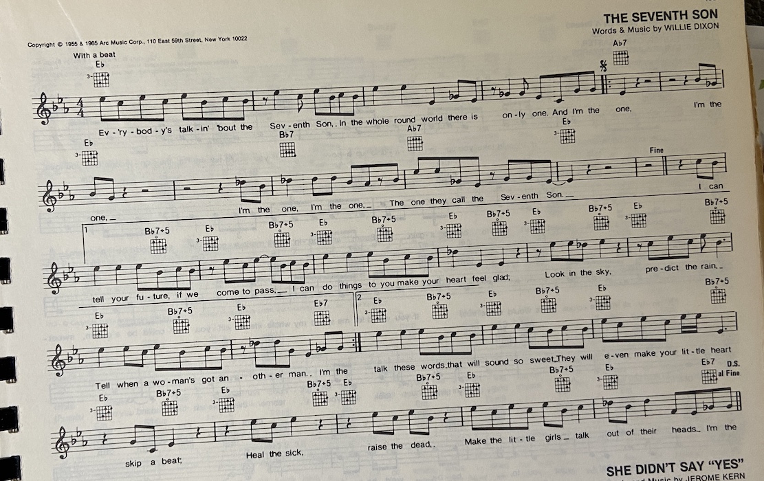 Seventh Son:Johnny Rivers. #7 in 1965. INTRO: E #1. E Everybody's talkin' 'bout the seventh son.. E7 in the whole wide world there is only one. A E B And I'm the one, I'm the one..I'm the one, A E B I'm the one..the one they call the seventh son. #2. E I can tell your future, it will come to pass. E7 E I can do things to you make your heart feel glad. E E7 Look in the sky, predict the rain.. E E7 tell when a woman's got another man. CHORUS: A E I'm the one, oh, I'm the one.. B I'm the one, I'm the one.. A E B the one they call the seventh son. #3. E I can talk these words that will sound so sweet.. E7 E they will even make your little heart skip a beat. E Heal the sick, raise the dead..make the little girls E7 talk outta their heads. CHORUS: A E I'm the one, oh, I'm the one.. B I'm the one, I'm the one.. A E B the one they call the seventh son. (INTERLUDE:) #4. E I can talk these words that will sound so sweet.. E7 E they will even make your little heart skip a beat. E Heal the sick, raise the dead..make the little girls E7 talk outta their heads. CHORUS: A E I'm the one, oh, I'm the one.. B I'm the one, I'm the one.. A E B the one they call the seventh son. OUTRO: E A I'm the one..I'm the one..oh, I'm the one, babe. E B Oooo, I'm the one..I'm the one, I'm the one.. A E B the one they call the seventh son. B A I'm the one, I'm the one..the one they call E the seventh son. A sixties smash from Kraziekhat.X