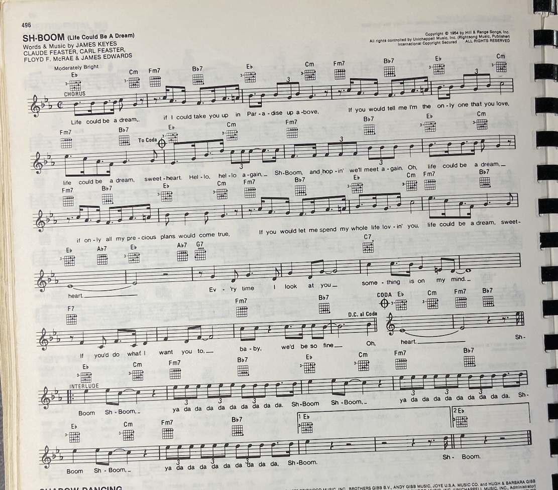 F Dm Gm Oh, life could be dream (sh-boom) C7 F Dm Gm If I could take you up in paradise up above (sh-boom) C7 F Dm If you would tell me I'm the only one that you love Gm C7 F Life could be a dream sweetheart Dm Gm C7 F Hello hello 'gain, sh-boom and hopin' meet a-boo-ba F Dm Gm C7 F Hey nonny ding dong, alang alang alang (ah-'oom) Dm Gm C7 Ba-bib, ba-boo ba-doe-ba-dib F Dm Gm Oh, life could be dream (sh-boom) Gm C7 F Dm If only all my precious plans would come true (sh-boom) Gm C7 F Dm If you would let me spend my whole life lovin' you Gm C7 F Bb C7 Am F Life could be dream sweetheart(do-da-do-do-do-sh-boom) A Now every time I look at you D7 Something is on my mind (dat-dat-dat-dat-dat-duh) G If you do what I want you to Gm C7 Baby, we'd be so fine F Dm Gm Oh, life could be dream (sh-boom) C7 F Dm Gm If I could take you up in paradise up above (ah-boom) C7 F Dm If you would tell me I'm the only one that you love Gm C7 F Life could be a dream sweetheart Dm Gm C7 F Hello hello 'gain, sh-boom and hopin' meet a-boo-ba F Dm Gm C7 F Hey nonny ding dong, alang alang alang (ah-'oom) Dm Gm C7 Ba-bib, ba-boo ba-doe-ba-dim F Dm Gm C7 F Oh life could be dream, life could be dream sweetheart F Dm Gm C7 (Sax Solo) F Dm Gm Oh, life could be dream (sh-boom) C7 F Dm Gm If I could take you up in paradise up above (ah-boom) C7 F Dm If you would tell me I'm the only one that you love Gm C7 F Life could be a dream sweetheart Dm Gm C7 F Hello hello 'gain, sh-boom and hopin' meet a-boo-ba F Dm Gm C7 F Hey nonny ding dong, alang ala 'lang ala 'lang ala (ah-o) Dm Gm C7 Bo-bib, a-bib-a-bo-a-dim F Dm Gm C7 F Bb C7 Am F Oh life could be dream, life could be dream sweetheart do-do-do-do-bim-sh-boomX