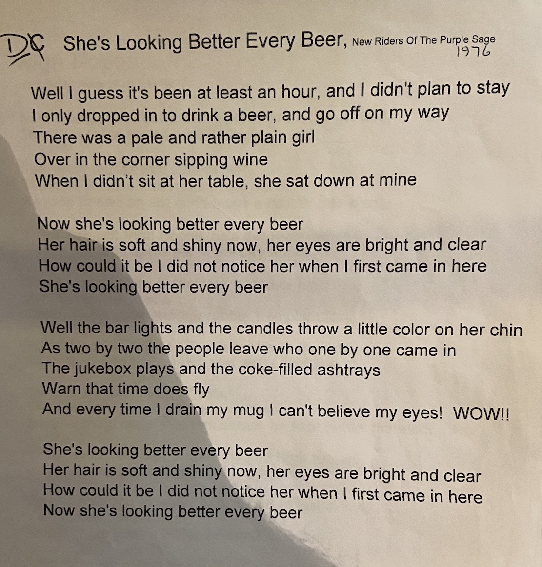 She's Looking Better Every Beer Lyrics: John Shine Music: John Shine Intro AGD D G Well I guess it's been at least an hour, and I didn't plan to stay A D I only dropped in to drink a beer, and float off on my way G It was a pale and rather plain girl over in the corner sipping wine A D When I did not sit down at her table, she sat down at mine Chorus G D And she's looking better every beer A D Her hair is soft and shiny now, her eyes are bright and clear G D How could it be I didn't notice her when I first came in here A D Now she's looking better every beer D G Well the bar lights and the candles throw a little color on the chin A D And two by two the people leave who one by one came in D G The jukebox plays and the coke-filled ashtrays warns the time that flies A D And every time I drain my mug I can't believe my eyes Chorus G D And she's looking better every beer A D Her hair is soft and shiny now, her eyes are bright and clear G D How could it be I didn't notice her when I first came in here A D Now she's looking better every beer