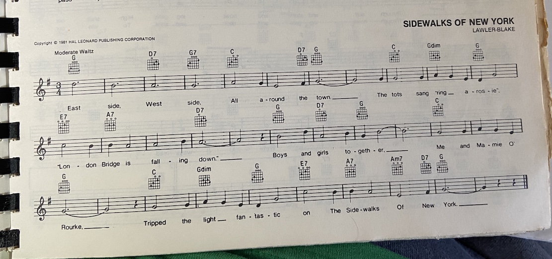 [G] The tots sang [D] 'Ring-a-Rosie' 'London [E7] Bridge is falling [A7] down! [D] Boys and girls together [G] Me and Mamie [D] O'Rorke. [G] Tripped the [D] light fantastic; [A7] On the side- [D] walks of New York