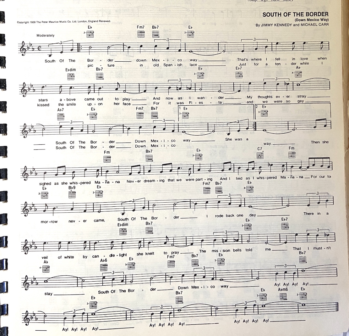 South of the [C] bor-[Em]der, [Dm] down [G] Mexico [C] way. Thatβs where I fell in love, when [Em] stars a-[Dm]bove came [G] out to play. [G7] And now as I [C] wander, [C7] my thoughts ever [F] stray, [Dm] south of the [C] bor-[Em]der, [Dm] down [G] Mexico [C] way