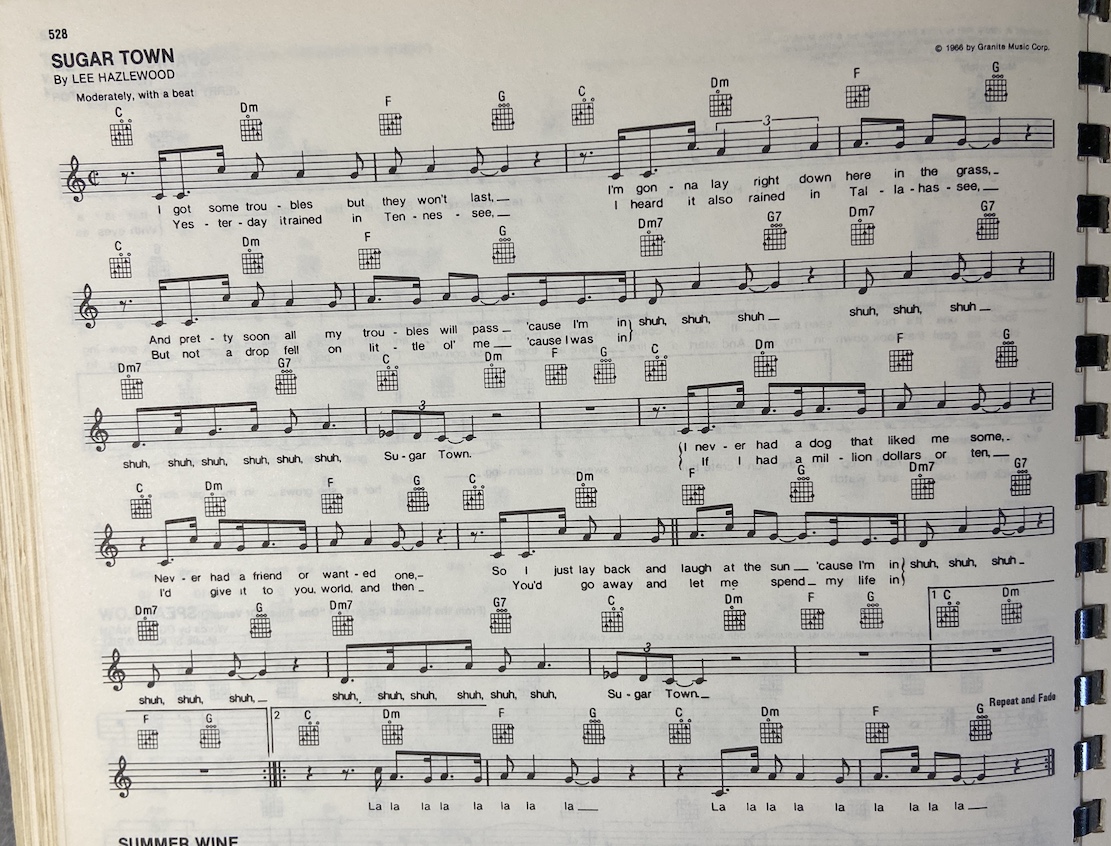 Sugar Town:Nancy Sinatra. #5 in 1966. INTRO: A Bm D C#m (2) (Capo 6th fret for original.) #1. A Bm D C#m I got some troubles but they won't last. A Bm D C#m I'm gonna lay right down here in the grass. A Bm D C#m And pretty soon all my troubles will pass, Bm E Bm E cause I'm in shoo-shoo-shoo, shoo-shoo-shoo, Bm E A Shoo-shoo, shoo-shoo, shoo-shoo Sugar Town. #2. A Bm D C#m I never had a dog that liked me some. A Bm D C#m Never had a friend or wanted one. A Bm D C#m So I just lay back and laugh at the sun, Bm E Bm E cause I'm in shoo-shoo-shoo, shoo-shoo-shoo, Bm E A Shoo-shoo, shoo-shoo, shoo-shoo Sugar Town. #3. A Bm D C#m Yesterday it rained in Tennessee. A Bm D C#m I heard it also rained in Tallahassee. A Bm D C#m But not a drop fell on little old me. Bm E Bm E cause I was in shoo-shoo-shoo, shoo-shoo-shoo, Bm E A Shoo-shoo, shoo-shoo, shoo-shoo Sugar Town. #4. A Bm D C#m If I had a million dollars or ten. A Bm D C#m I'd give to your world, and then, A Bm D C#m you'd go away and let me spend, Bm E Bm E my life in shoo-shoo-shoo, shoo-shoo-shoo, Bm E A Shoo-shoo, shoo-shoo, shoo-shoo Sugar Town. A Bm D C#m la-la-la-la-la-la-la-la...(x3)(fade) A sixties smash from Kraziekhat.X