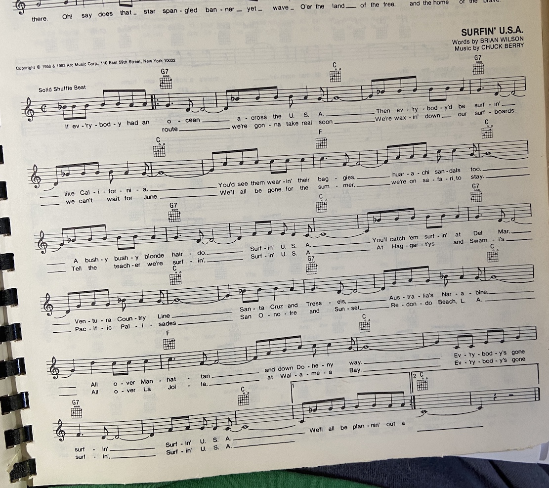 Surfinβ U.S.A. chords The Beach Boys 1963 https://en.wikipedia.org/wiki/Surfin%27_U.S.A. Capo III ** [Verse 1] C * G G7 If everybody had an ocean C Across the U.S.A. G G7 Then everybody'd be surfin' C C7 Like California F You'd seem 'em wearing their baggies C Huarachi sandals too G G7 F A bushy bushy blonde hairdo C Surfin' U.S.A. [Verse 2] C G G7 You'd catch 'em surfin' at Del Mar C Ventura County line G G7 Santa Cruz and Trestles C C7 Australia's Narrabeen F All over Manhattan C And down Doheny Way G G7 F Everybody's gone surfin' C Surfin' U.S.A. [Verse 3] C G G7 We'll all be planning out a route C We're gonna take real soon G G7 We're waxing down our surfboards C C7 We can't wait for June F We'll all be gone for the summer C We're on safari to stay G G7 F Tell the teacher we're surfin' C Surfin' U.S.A. [Verse 4] C G G7 Haggerties and Swamies C Pacific Palisades G G7 San Onofre and Sunset C C7 Redondo Beach L.A. F All over La Jolla C At Waimea Bay G G7 F Everybody's gone surfin' C Surfin' U.S.A. [Break] x3 C G G7 F Everybody's gone surfin' C G C Surfin U.S.A * You could add a C7 here if you like ** Alternate: Capo I C = D C7 = D7 G = A G7 = A7 F = G Set8X