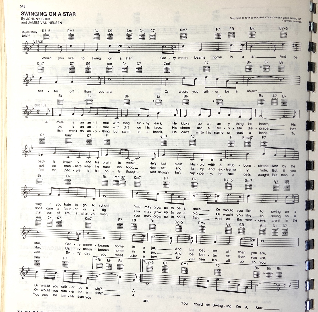 Would you [D7] like to swing on a [G7] star?Β Carry [C] moonbeams home in a [F] jar?Β And be [D7] better off than you [G7] are,Β [C7] or would you rather be a [F] pig?