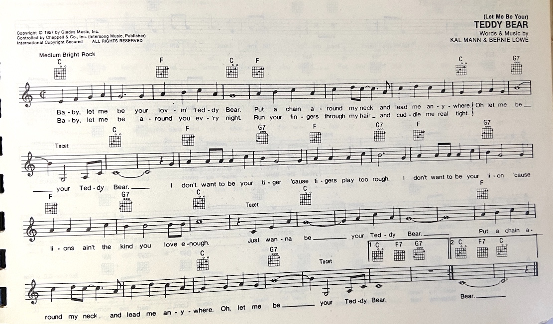 [TURN-AROUND] – – – – – Just wanna [C] be your teddy bear. [F] Put a chain around my neck, and lead me anywhere. Oh, let me [G7] be your teddy [C] bear.