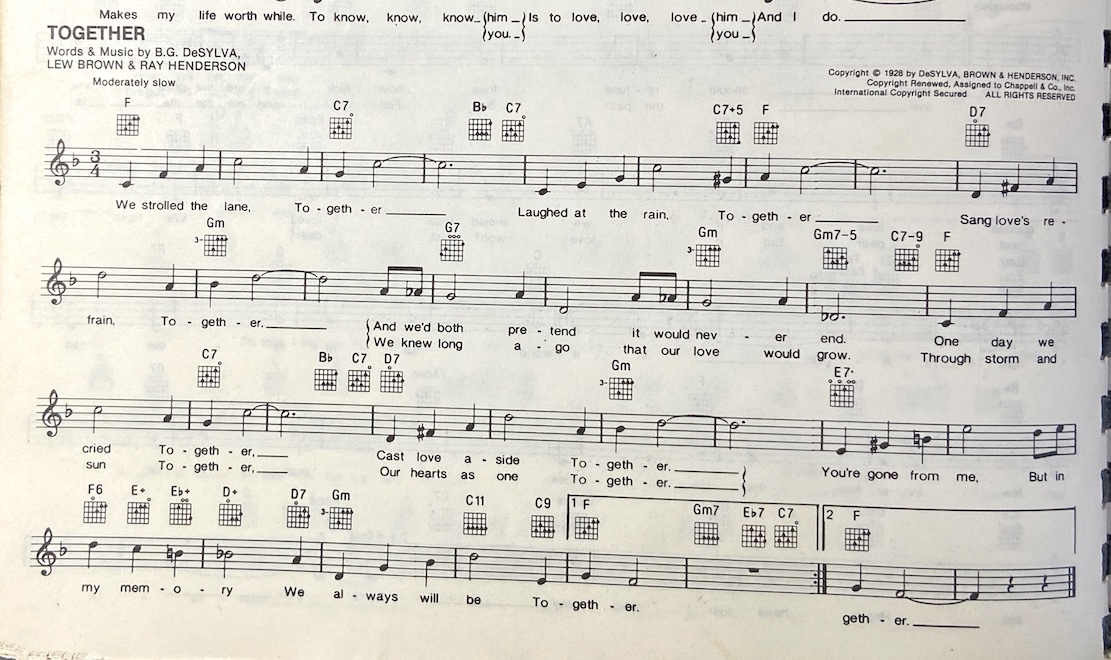 Video https://www.youtube.com/watch?v=B09jdbqB_ck Key G Three-four time [Intro] C C Dm Fm C A Dm7 G [Verse 1] C Dm7 G7 We strolled the lane together C Laughed at the rain together A7 Dm Sang loves refrain together D7 Dm7 G7 You knew long ago that our love would grow C Dm7 G7 Through storm and sun together A7 Dm Our hearts as one together B7 C B7 A7 You're gone from me but in my mem-or---y Dm G7 C We always will be together *** Key change on video to Ab, flat the chords or capo 1 *** G7 [Verse 2] C Dm7 G7 We strolled the lane together C Laughed at the rain together A7 Dm Sang loves refrain together D7 Dm7 G7 And we both pretend it would never end C Dm7 G7 One day we cried together A7 Dm Cast love aside forever B7 C B7 A7 You're gone from me but in my mem-or---y Dm G7 C We always will be together [Outro] C Dm G7 G7 G7 C C A7 A7 Dm7 Dm7 DX