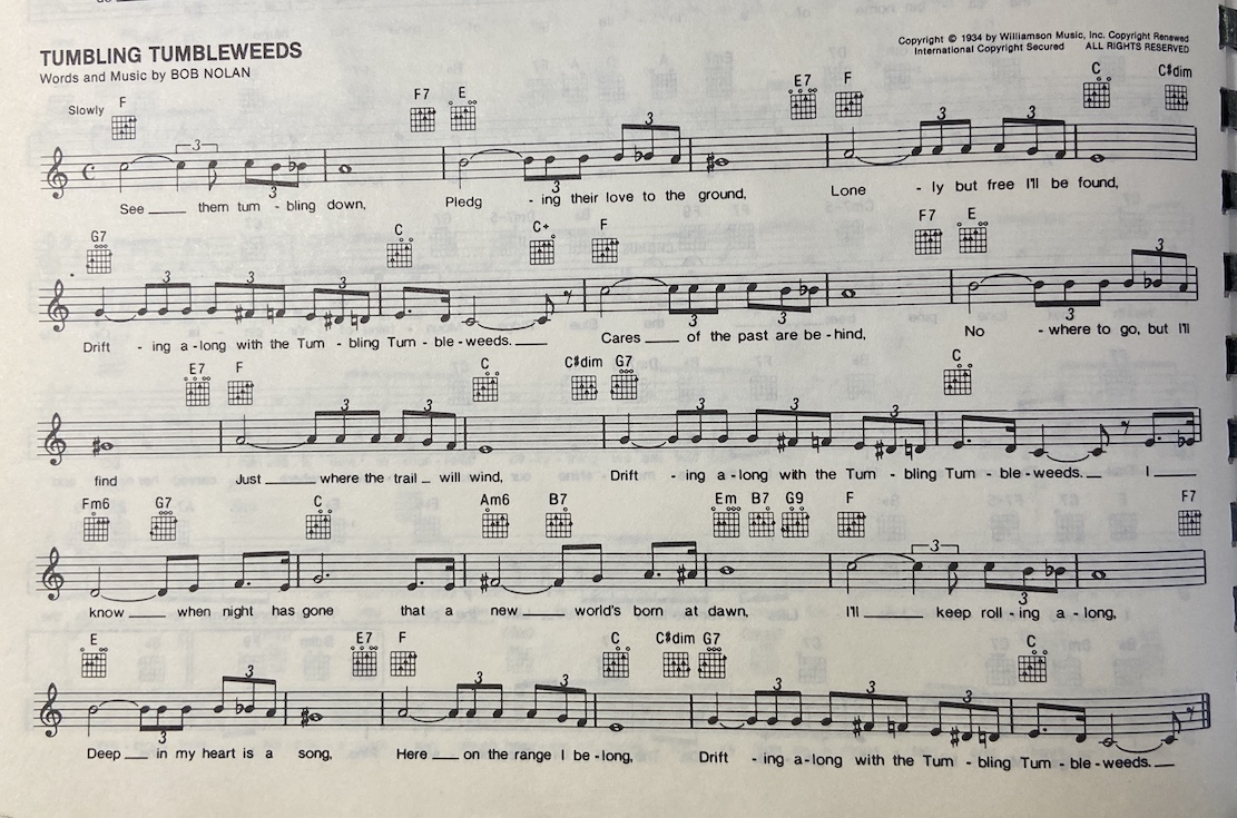 I’m a roaming cowboy riding all day long.  Tumbleweeds around me sing their lonely song.  Nights underneath the prairie moon, I ride along and sing this tune