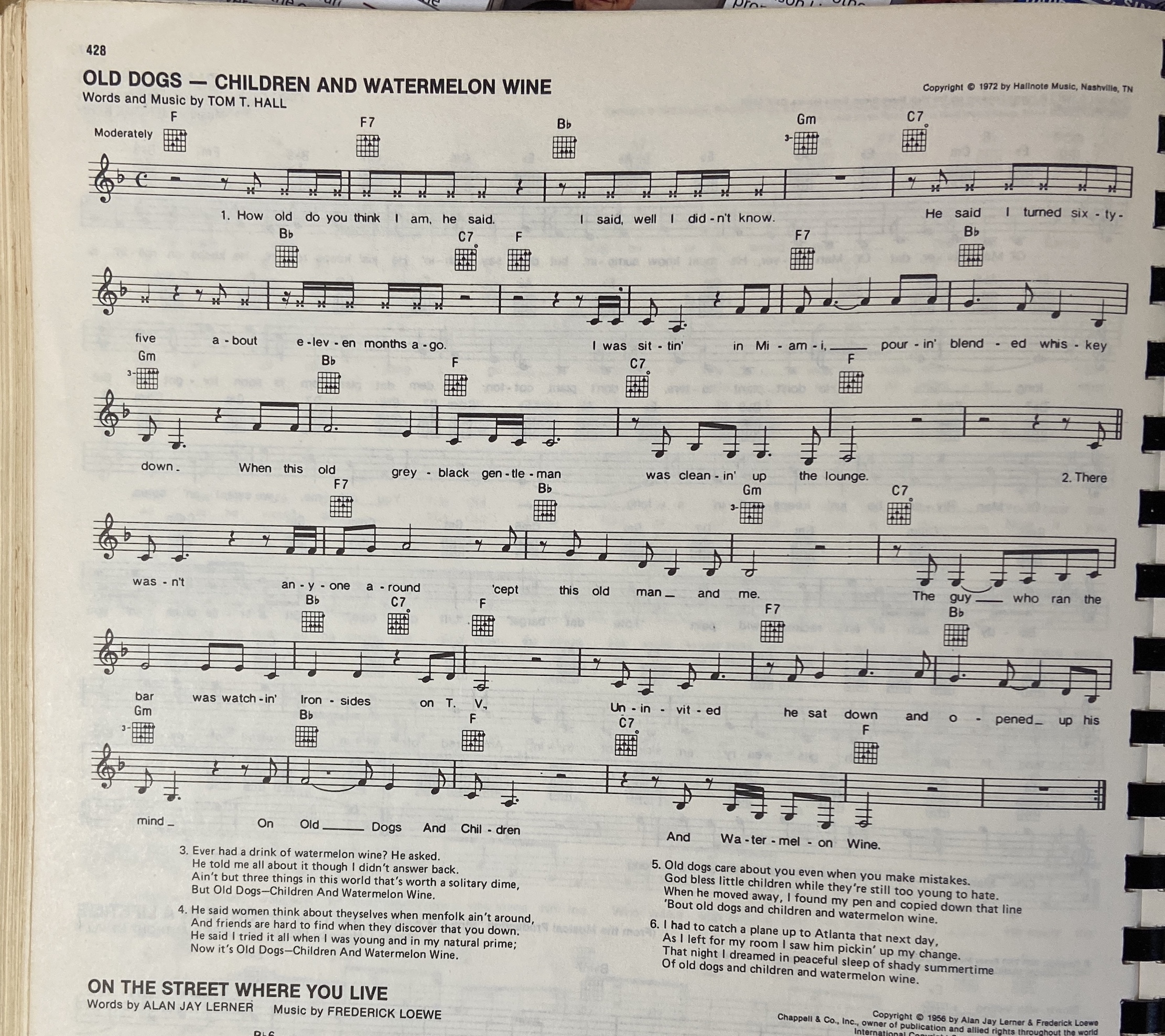 Old Dogs, Children And Watermelon Wine By Tom T. Hall [Verse] G How old do you think I am he said C I said well I didn’t know D7 C G He said I turned 65 about 11 months ago C Am I was sitting in Miami pouring blended whisky down C G Am D7 G When this old grey black gentleman was cleaning up the lounge G7 C Am There wasn't any one around but this old man and me D7 C D7 G The guy who tended bar was watching Ironsides on TV G7 C Am Uninvited he sat down and opened up his mind C G Am D7 G On old dogs and children and watermelon wine G7 C Am Have you ever had a drink of watermelon wine he asked D7 C D7 G He told me all about it though I didn't answer back G7 C Am Ain't but three things in life that's worth a solitary dime C G Am D7 G That's old dogs and children and watermelon wine G7 C Am He said women think about themselves when their men-folk aren't around D7 C D7 G And friends are hard to find when they discover that you're down G7 C Am He said I tried it all when I was young and in my natural prime C G Am D7 G Now it's old dogs and children and watermelon wine G7 C Am He said old dogs care about you even when you make mistakes D7 C D7 G God bless little children while they're still too young to hate G7 C Am As he moved away I got my pen and copied down that line C G Am D7 G On old dogs and children and watermelon wine G7 C Am I had to catch a plane up to Atlanta the next day D7 C D7 G As I left for my room I saw him picking up my change G7 C Am That night I dreamed in peaceful sleep of shady summer times C G Am D7 G Of old dogs and children and watermelon wine