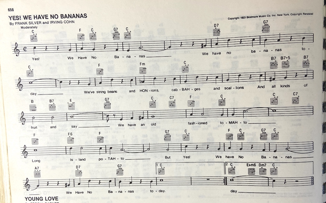 <<<Β [C] Yes, we [F] have [C] no bananas.Β We [D7] have no ba- [G7] -nanas to [C] day.