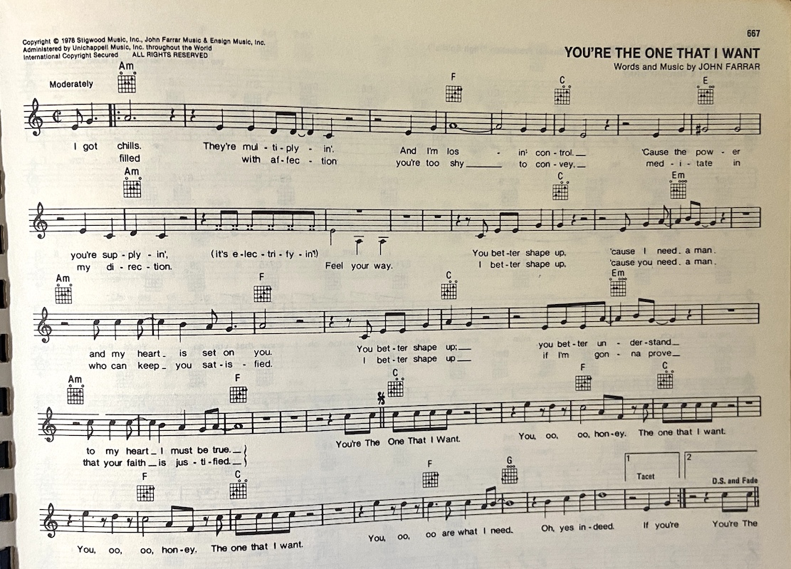 >>>> You're the [C] one that I want (you are the one for me) [F] Ooh, ooh, ooh, honey